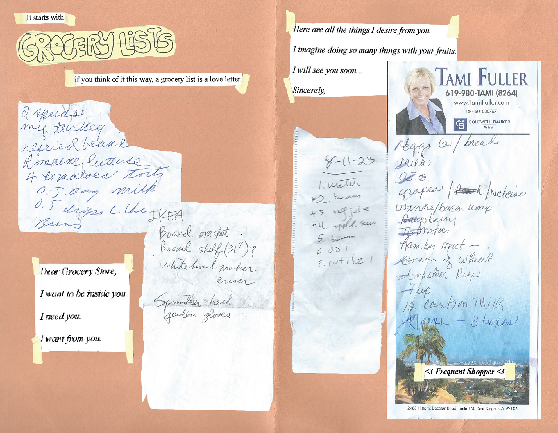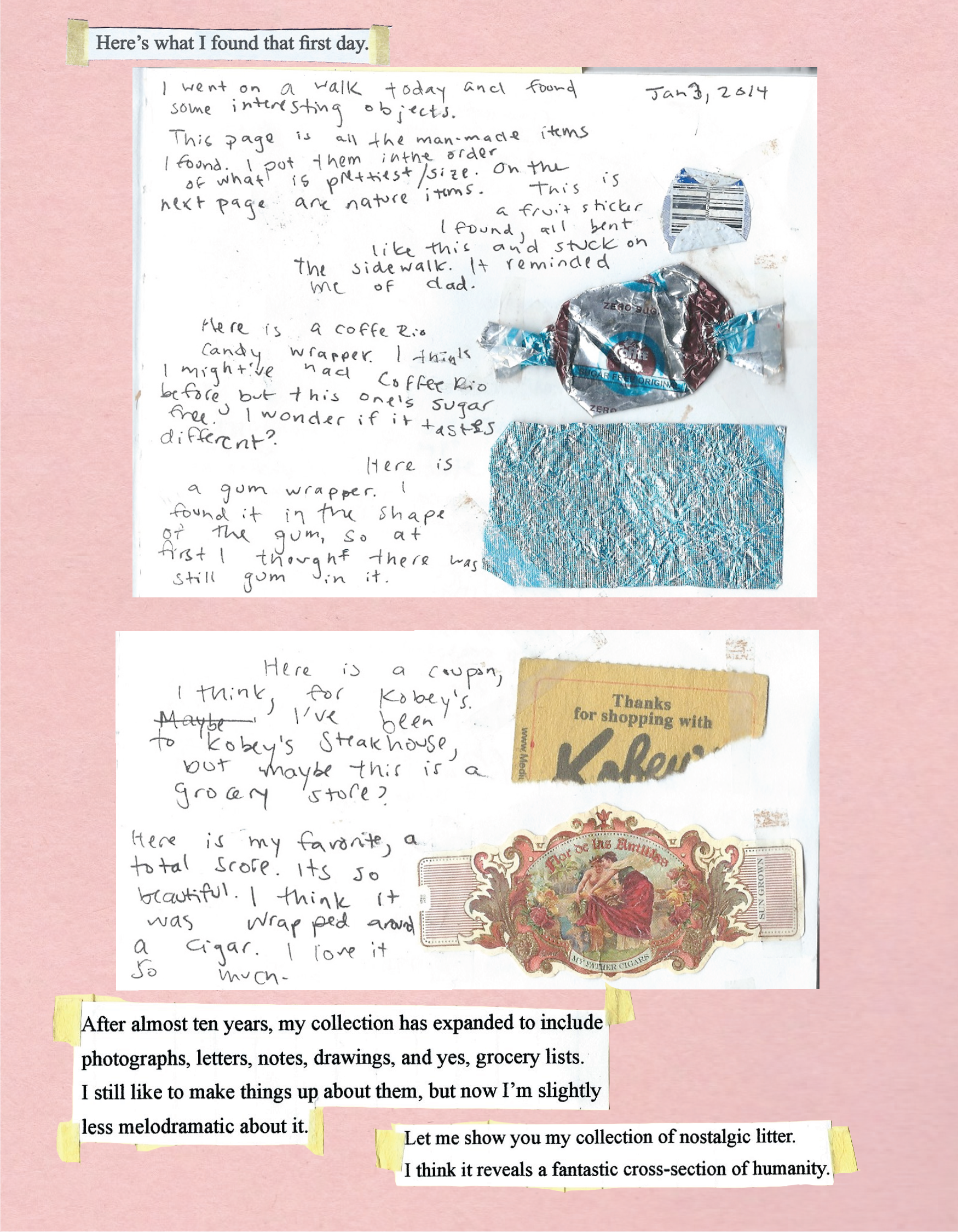 This zine is a narrative exploration of the found ephemera-scraps of notes, grocery lists, and photos collected on walks- that I have archived for over a decade.
